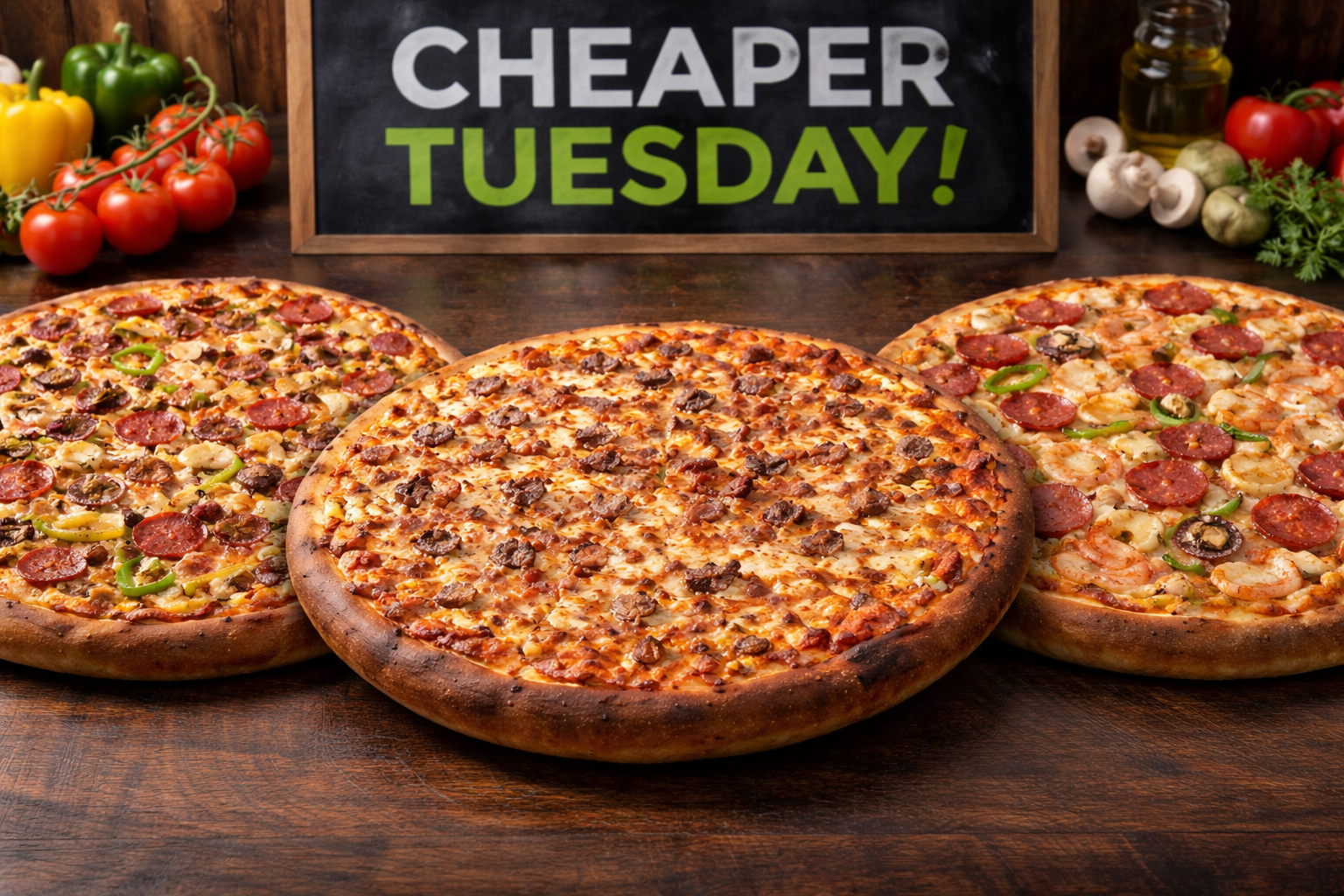 2x large pizzas, 1x garlic bread, 1x 1.25L bottle